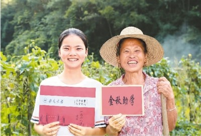 教育是民族振興、社會進步的重要基石。當前,中國高等教育由大眾化階段向普及化階段邁進。圖為2020年9月8日,安徽安慶宿松縣柳坪鄉(xiāng)村民鄧愛蘭(右)和孫女吳婷華展示大學錄取通知書和助學金。