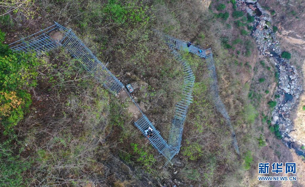 在四川省涼山彝族自治州昭覺(jué)縣阿土列爾村的懸崖鋼梯上,村民沿著鋼梯下山(2020年5月13日攝,無(wú)人機(jī)照片)。新華社記者 王曦 攝