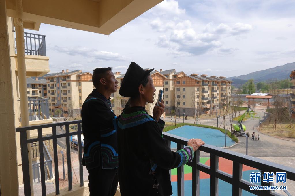 在四川省昭覺(jué)縣城易地扶貧搬遷安置點(diǎn)南坪社區(qū),剛搬遷到新家的“懸崖村”村民莫色達(dá)體夫婦在陽(yáng)臺(tái)給親戚打電話(2020年5月13日攝)。新華社記者 江宏景 攝