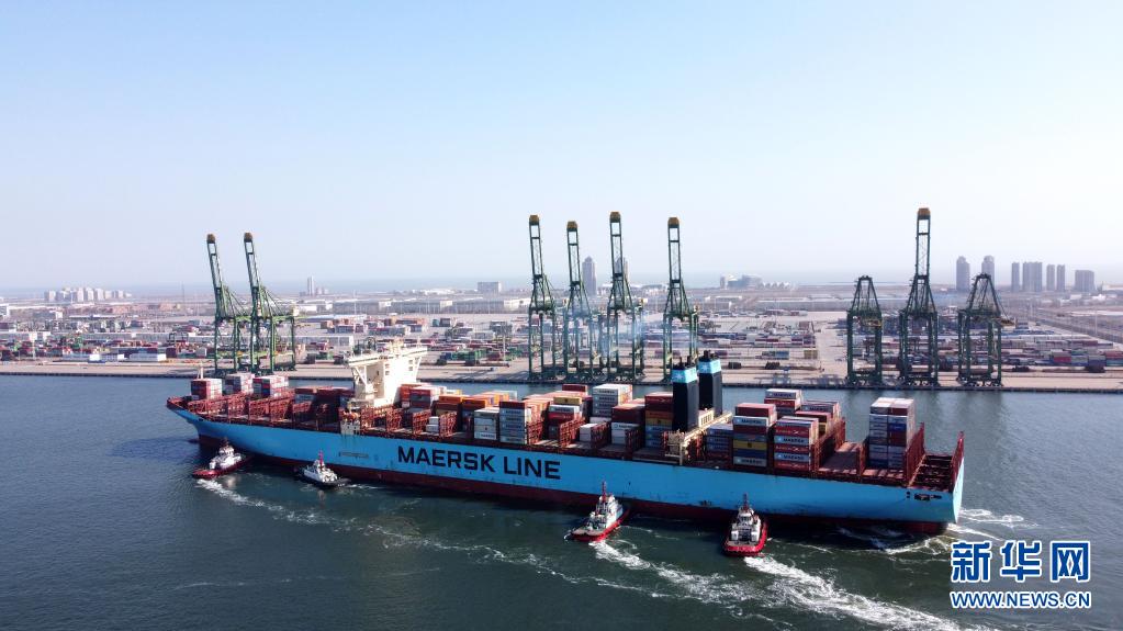 一艘載有集裝箱的貨輪駛?cè)胩旖蚋鄞a頭(2月22日攝,無(wú)人機(jī)照片)。新華社記者 趙子碩 攝