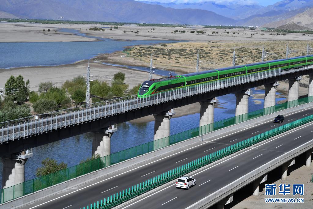 試運(yùn)行的復(fù)興號(hào)列車行駛在雅魯藏布江畔(6月16日攝)。新華社記者 覺(jué)果 攝
