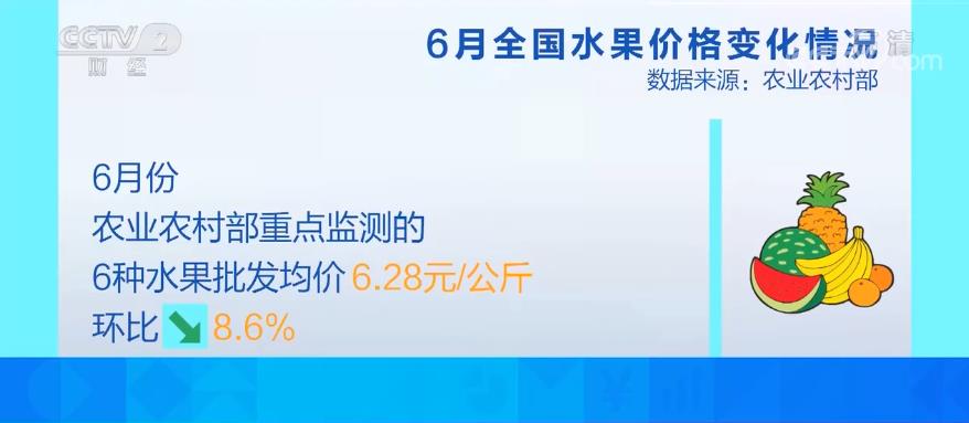 數(shù)據(jù)顯示,6月份農(nóng)業(yè)農(nóng)村部重點(diǎn)監(jiān)測(cè)的6種水果批發(fā)均價(jià)每公斤6.28元,環(huán)比下降8.6%。