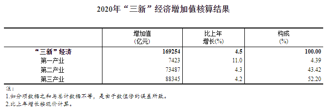2020年,盡管受到突如其來的新冠肺炎疫情的巨大沖擊和嚴峻復雜國際形勢的影響,我國新產(chǎn)業(yè)新業(yè)態(tài)新商業(yè)模式仍繼續(xù)保持增長。經(jīng)核算,2020年我國“三新”經(jīng)濟增加值為169254億元,比上年增長4.5%(未扣除價格因素,下同),比同期國內(nèi)生產(chǎn)總值(GDP)現(xiàn)價增速高1.5個百分點;相當于GDP的比重為17.08%,比上年提高0.7個百分點。