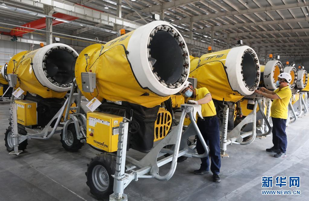 7月7日,在張家口高新區(qū)冰雪運動裝備產(chǎn)業(yè)園,一家冰雪設備生產(chǎn)公司工作人員在車間查驗造雪機。