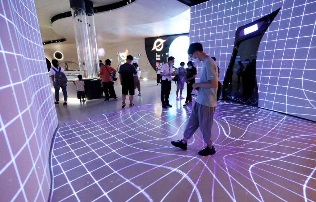 上海天文館引入體感互動(dòng)、數(shù)據(jù)可視化、增強(qiáng)現(xiàn)實(shí)(AR)、虛擬現(xiàn)實(shí)(VR)、生物識(shí)別等技術(shù),精心設(shè)計(jì)環(huán)境氛圍、燈光音效和高仿真場(chǎng)景模擬手段,構(gòu)建沉浸式宇宙空間體驗(yàn)環(huán)境。值得一提的是,上海天文館的300余件展品中,互動(dòng)展品占比50%以上。