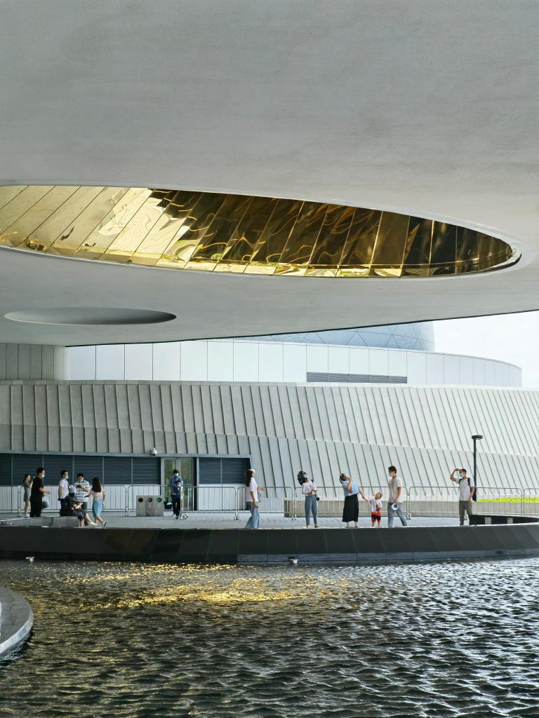 從空中俯瞰,整個(gè)天文館像一座表現(xiàn)時(shí)間流逝的大型天文儀器。主建筑以優(yōu)美的螺旋形態(tài)構(gòu)成“天體運(yùn)行軌道”,獨(dú)具特色的圓洞天窗、球幕影院和倒轉(zhuǎn)穹頂這三個(gè)圓形元素構(gòu)成“三體”結(jié)構(gòu),共同詮釋天體運(yùn)行的基本規(guī)律。其中,圓洞天窗位于主建筑的入口,當(dāng)太陽光穿過圓洞,會(huì)在地面形成光斑,隨著太陽在天空中移動(dòng),光斑也將在地面上緩緩移動(dòng),起到像日晷一樣的作用。