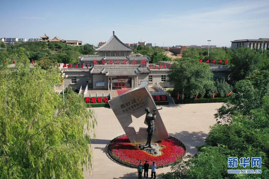 寧夏吳忠市同心縣紅軍西征紀(jì)念館前的小號手雕塑(無人機(jī)照片,6月22日攝)。新華社記者 王鵬 攝