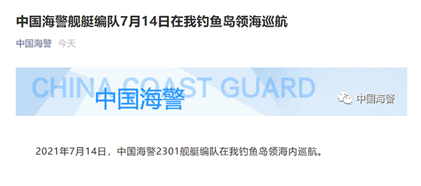 中國臺灣網(wǎng)7月14日訊 據(jù)“中國海警”微信公眾號7月14日消息,2021年7月14日,中國海警2301艦艇編隊在我釣魚島領(lǐng)海內(nèi)巡航。(完)
