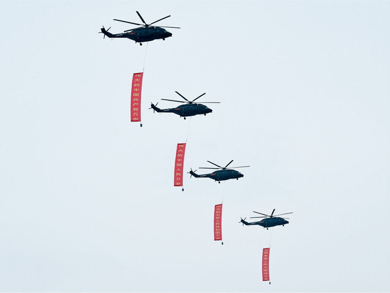 2021年7月1日上午,慶祝中國(guó)共產(chǎn)黨成立100周年大會(huì)在北京天安門(mén)廣場(chǎng)隆重舉行。在大會(huì)開(kāi)始前的飛行慶祝表演上,沿著黨旗指引的方向,4架直升機(jī)分別懸掛寫(xiě)有“偉大的中國(guó)共產(chǎn)黨萬(wàn)歲”、“偉大的中國(guó)人民萬(wàn)歲”、“偉大的中華人民共和國(guó)萬(wàn)歲”、“全國(guó)各族人民大團(tuán)結(jié)萬(wàn)歲”的巨幅標(biāo)語(yǔ)迎風(fēng)向前。 新華社記者 戴天放/攝