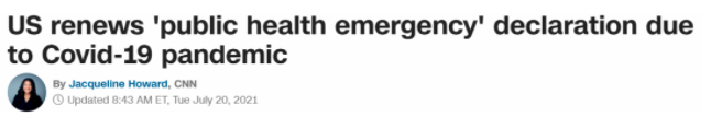由于新冠病毒德爾塔變異株加速蔓延和疫苗接種推進(jìn)受阻導(dǎo)致多地疫情反彈,美國衛(wèi)生與公眾服務(wù)部日前宣布自當(dāng)?shù)貢r間20日起,將去年1月以來美國一直在實(shí)施的“公共衛(wèi)生緊急狀態(tài)”再次延長90天。