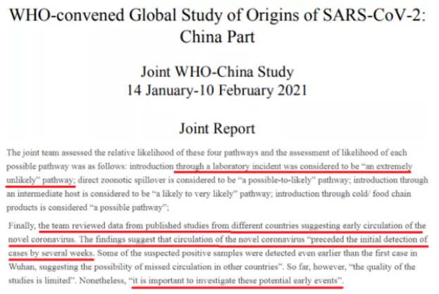 △根據(jù)世衛(wèi)組織溯源報告得出的結(jié)論,新冠病毒“極不可能”通過實(shí)驗(yàn)室傳人;需要進(jìn)一步調(diào)查世界其他地方出現(xiàn)的早期陽性樣本。