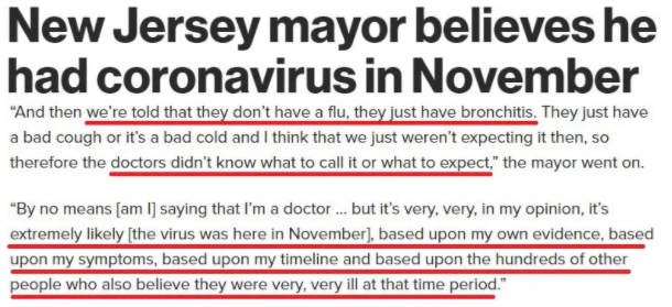 ——“根據(jù)我自己的證據(jù)、癥狀和病情發(fā)展,以及其他數(shù)百人也表示他們在那個時期病得非常非常厲害的事實(shí),新冠病毒極有可能已經(jīng)在11月出現(xiàn)。”