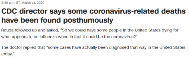 去年3月11日,當(dāng)時的美國疾控中心(CDC)主任雷德菲爾德在國會眾議院一次聽證會上就承認(rèn),美國確實(shí)有原本被診斷為流感、實(shí)際上卻是因?yàn)楦腥拘鹿诓《径劳龅牟±?/p>