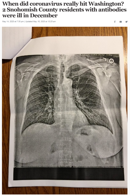 △《西雅圖時報》報道截圖(題圖中的X光片顯示其中一位斯諾霍米什縣居民的肺部“過度充氣”并出現(xiàn)“線性混濁”。醫(yī)生認(rèn)為,這可能是疊加上呼吸道肺部感染的表現(xiàn)。)