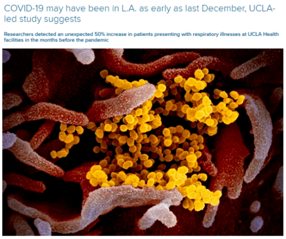 加州大學(xué)洛杉磯分校去年9月10日宣布,該校與華盛頓大學(xué)合作研究發(fā)現(xiàn),從2019年12月下旬開始并持續(xù)到2020年2月的呼吸道癥狀和疾病患者數(shù)量明顯增加,表明新冠病毒在具有臨床意識和檢測能力之前就已經(jīng)在美國的社區(qū)傳播。