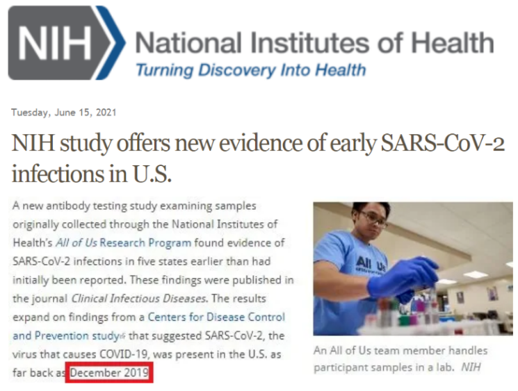 就在上個月15日,美國國立衛(wèi)生研究院(NIH)最新公布的研究結(jié)果支持了CDC的研究發(fā)現(xiàn):新冠病毒早在2019年12月就已在美國傳播。