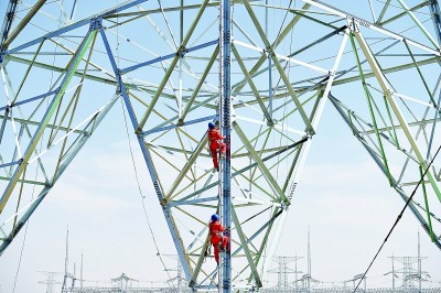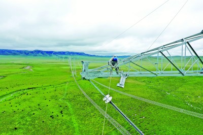國網(wǎng)青海省電力檢修公司專業(yè)人員在青豫特高壓直流輸電線作業(yè)。新華社發(fā)