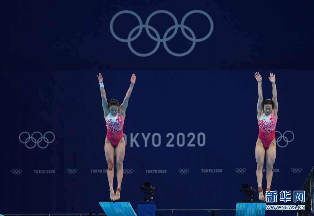 7月25日,中國選手施廷懋(右)/王涵在比賽中。當日,東京奧運會跳水女子雙人三米跳板決賽在東京水上運動中心舉行。新華社記者 許暢 攝