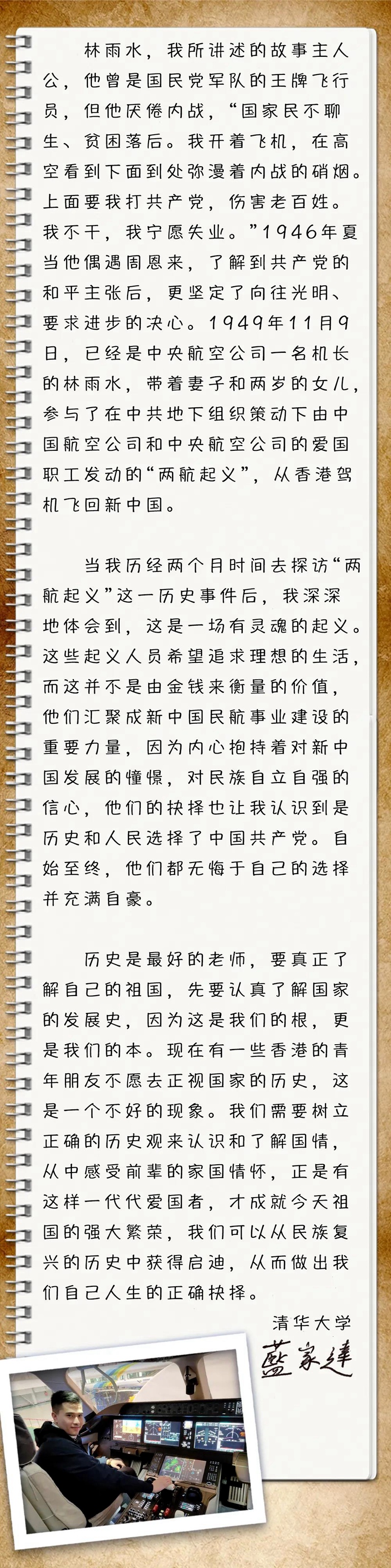 我叫藍家達,是一個土生土長的香港年輕人,現(xiàn)在在清華大學讀博士。我自小就很喜歡讀歷史,但“我的家我的國”節(jié)目組提出要探訪1949年在香港發(fā)生的“兩航起義”時,我卻一無所知。在北京的民航博物館,我看到了一張“兩航起義”人員的合影,大家臉上展露著燦爛自豪的笑顏,當中還有一個被抱在懷里的幼兒,她是誰?為什么她會和起義人員在一起?專家告訴我,這張合影背后是一段人心向背的故事。
