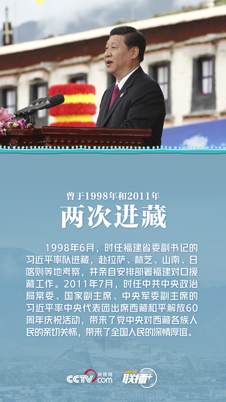 習(xí)近平總書記始終心系西藏。早在1998年6月,在福建工作時,習(xí)近平就因?qū)谠蝿?wù)而來到西藏考察。2011年7月,習(xí)近平作為中央代表團團長,出席西藏和平解放60周年慶;顒。黨的十八大以來,以習(xí)近平同志為核心的黨中央立足實際,著眼長遠(yuǎn),圍繞西藏經(jīng)濟社會發(fā)展和長治久安大計,作出一系列重大決策部署,譜寫出雪域高原中國夢的新篇章。