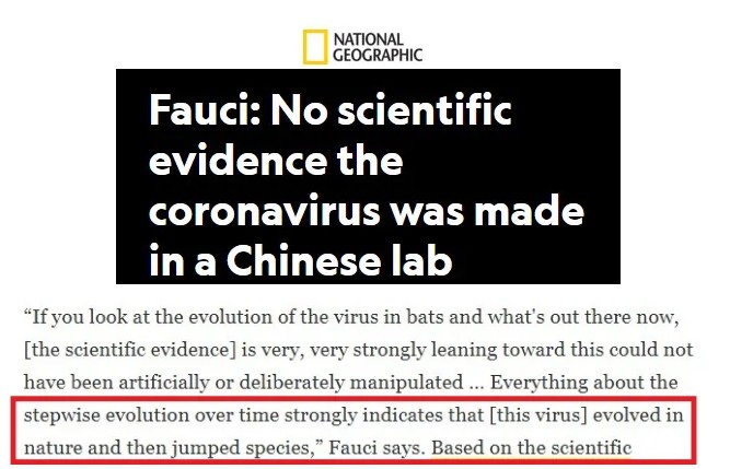 去年5月,美國(guó)國(guó)家過(guò)敏癥和傳染病研究所所長(zhǎng)福奇向《美國(guó)國(guó)家地理》雜志表示,所有關(guān)于逐級(jí)進(jìn)化的證據(jù)都強(qiáng)烈指向,新冠病毒是在自然界進(jìn)化完成,然后再跨越物種傳到人身上的。