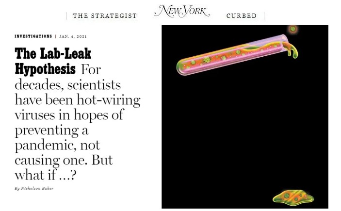 其后“實(shí)驗(yàn)室泄漏說(shuō)”在美國(guó)掀起的一點(diǎn)小風(fēng)浪,源自今年1月小說(shuō)家尼克爾森·貝克在《紐約雜志》上發(fā)表的一篇封面文章,文章中提到了一個(gè)精心設(shè)計(jì)的實(shí)驗(yàn)室。