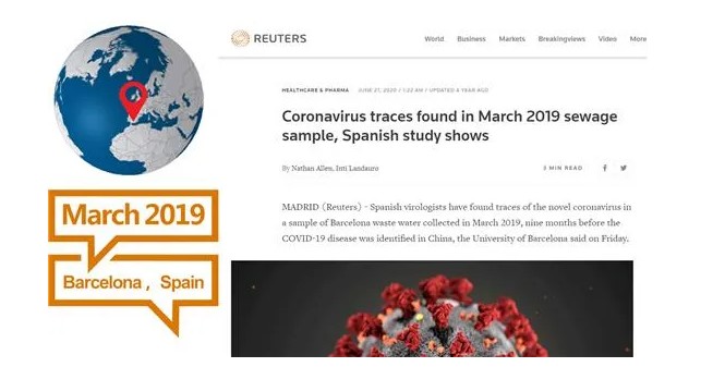 路透社2020年6月報(bào)道說(shuō),西班牙巴塞羅那大學(xué)領(lǐng)導(dǎo)的一個(gè)研究小組在2019年3月采集的巴塞羅那廢水樣本中檢測(cè)出新冠病毒。