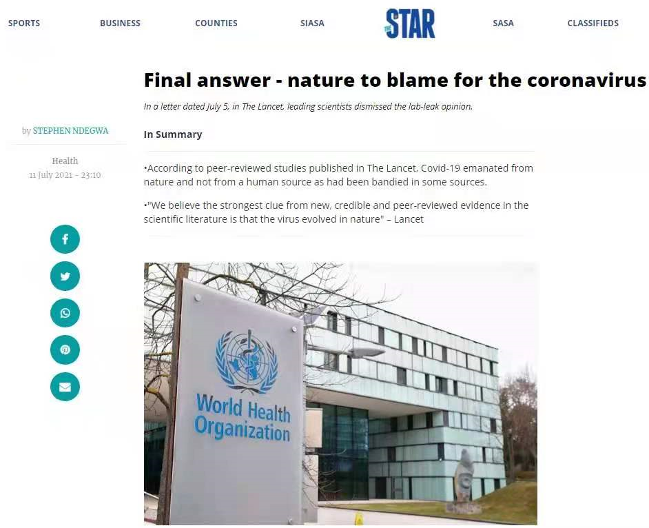 近日,肯尼亞《星報》發(fā)表學者恩德格瓦的評論文章,引用《柳葉刀》雜志發(fā)表的科學家公開信主要內容,駁斥新冠病毒“實驗室泄漏”陰謀論,贊賞中國團結抗疫,呼吁各國尊重科學、集中力量和資源抗擊疫情。