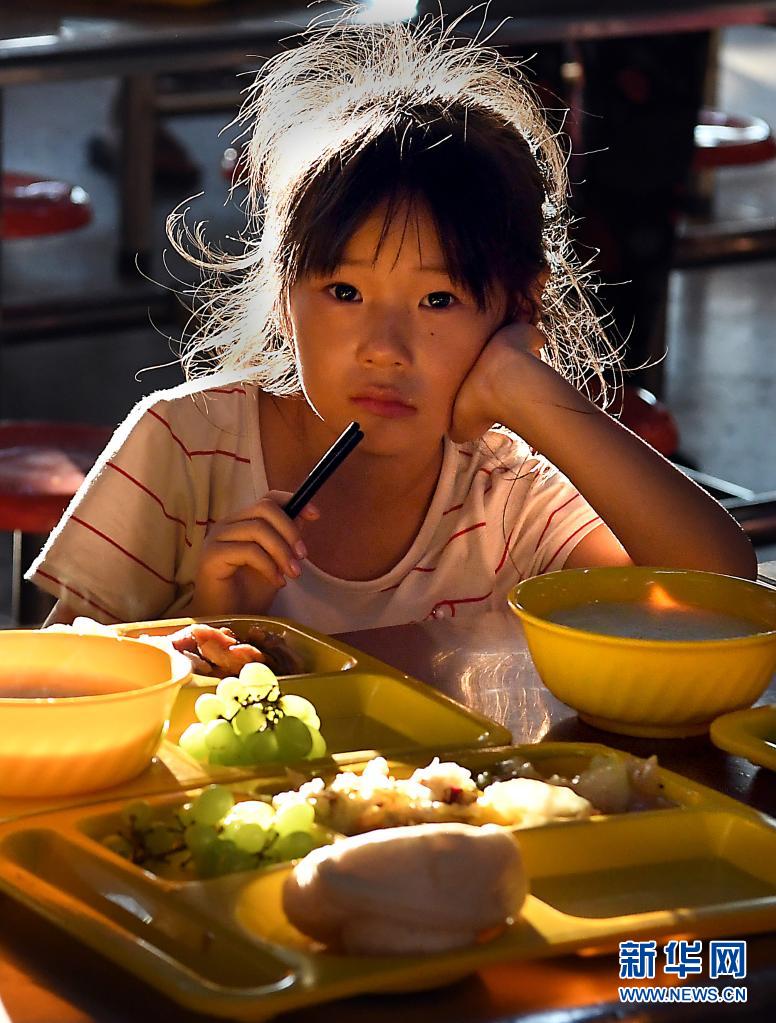 7月29日,一名小朋友在鶴壁市?h黎陽(yáng)中學(xué)長(zhǎng)豐校區(qū)安置點(diǎn)內(nèi)吃晚飯。