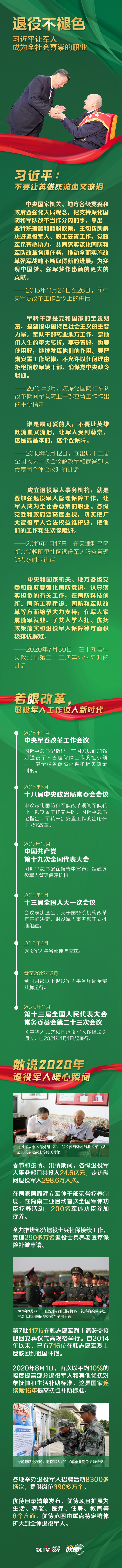 數(shù)百萬退役軍人得到妥善安置,撫恤補助標準連年提高,部分退役士兵社會保險得以接續(xù),退役軍人就業(yè)創(chuàng)業(yè)環(huán)境不斷優(yōu)化……廣大退役軍人感受到了實實在在的溫暖,全社會掀起了關愛退役軍人之風。央視網(wǎng)《聯(lián)播+》特推出長圖解,與您一起學習了解。
