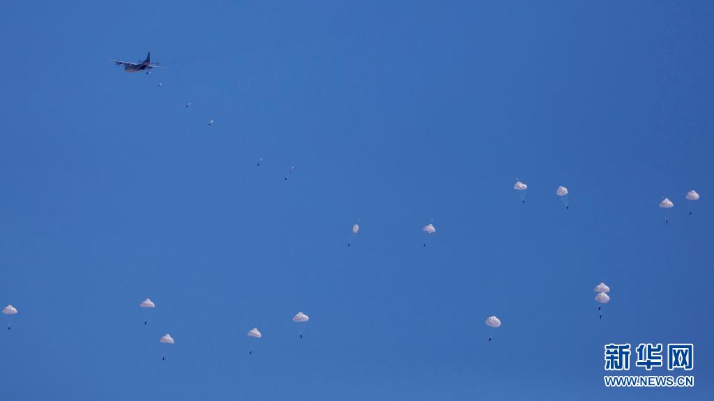 在“西部·聯(lián)合-2021”演習(xí)第一次實(shí)兵實(shí)裝實(shí)彈合練中,運(yùn)-9飛機(jī)搭載空降兵進(jìn)入“敵”縱深地域上空實(shí)施集群傘降(8月5日攝)。新華社記者 劉芳 攝