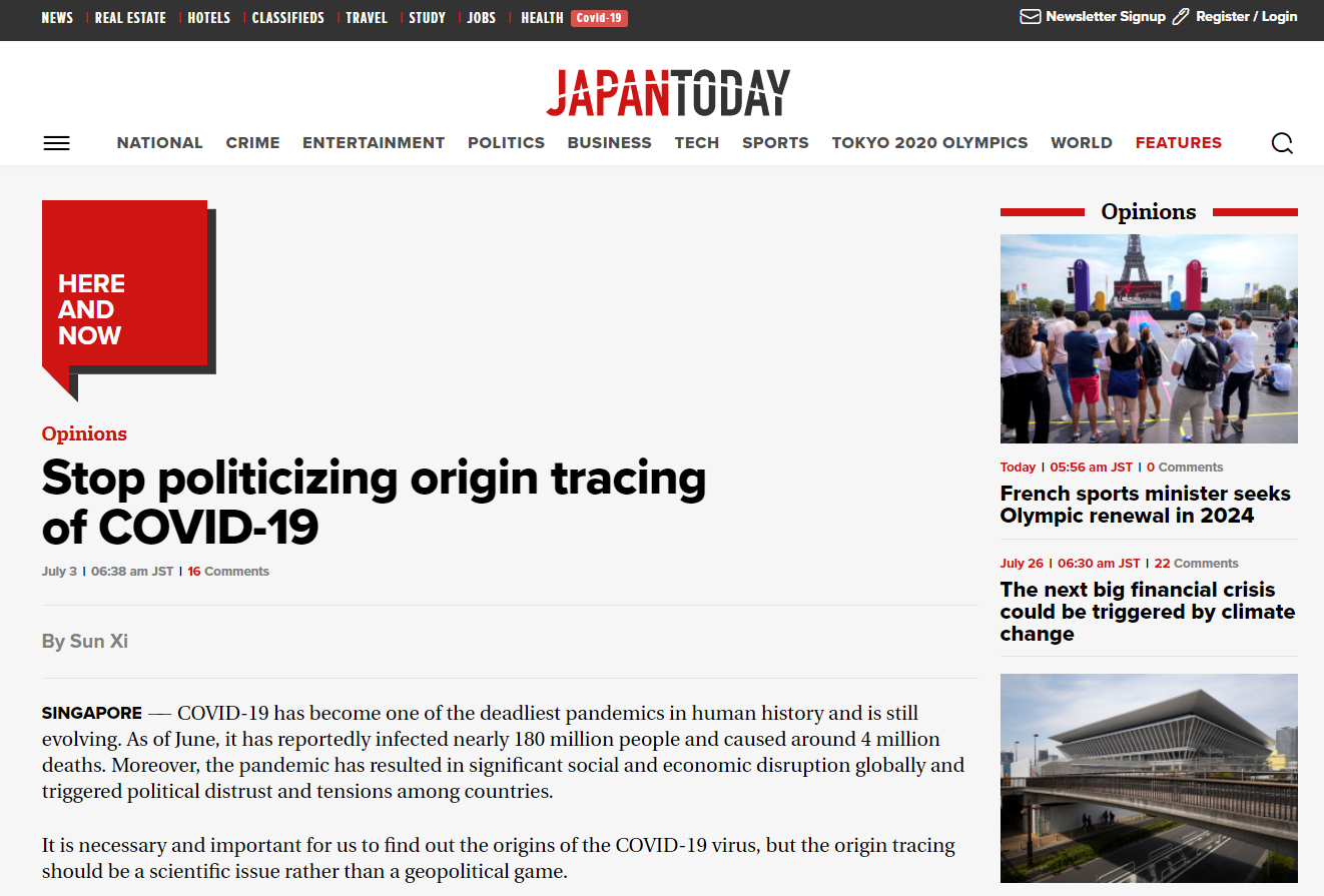 近日,日媒《今日日本》刊發(fā)新加坡獨立評論作家孫喜的評論文章,批評美國將新冠病毒溯源問題政治化。