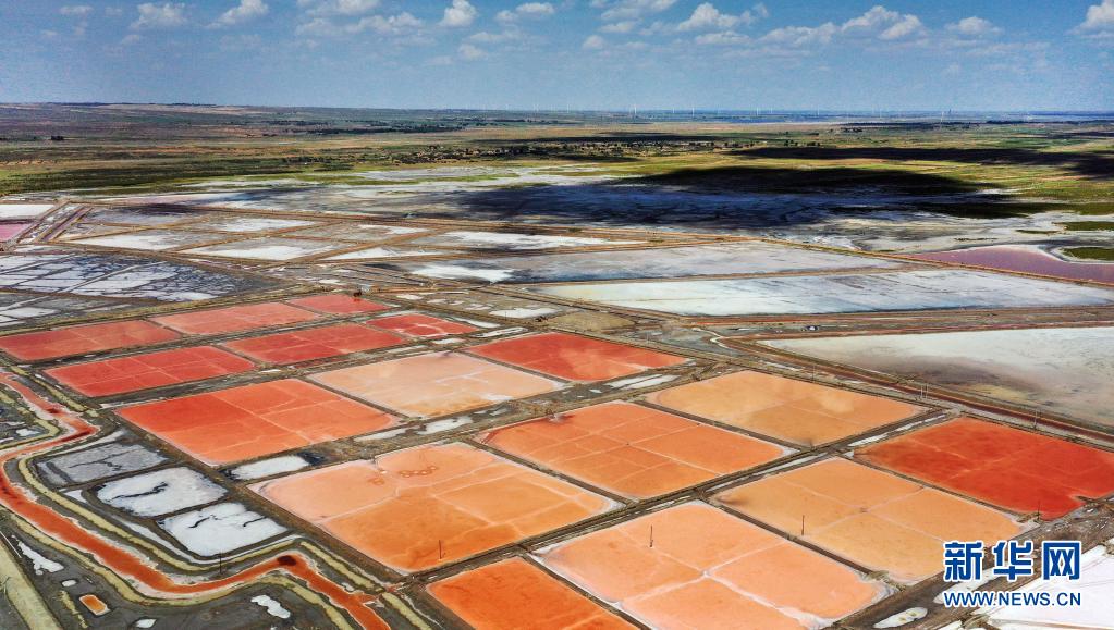 陜西省榆林市定邊縣是陜西省的湖鹽產(chǎn)區(qū),鹽湖群主要分布在一條西南至東北走向的弧線低洼地帶。每年的夏秋時(shí)節(jié),湖中不同的礦物成分和藻類,讓鹽田在高溫和光線的共同作用下呈現(xiàn)出五彩斑斕的顏色,仿佛鋪陳在大地上的調(diào)色板。