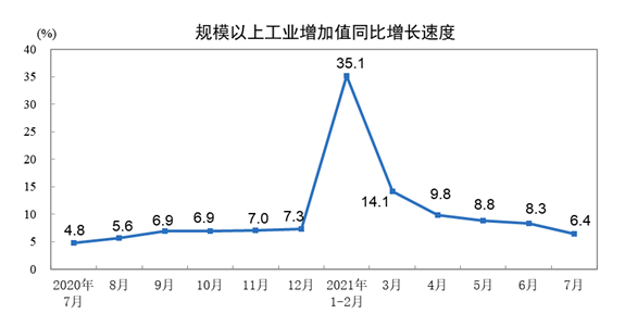 7月份,全國規(guī)模以上工業(yè)增加值同比增長6.4%,比6月份回落1.9個百分點,高于2019年、2020年同期增速;兩年平均增長5.6%;環(huán)比增長0.30%。分三大門類看,采礦業(yè)增加值同比增長0.6%;制造業(yè)同比增長6.2%;電力、熱力、燃氣及水生產(chǎn)和供應(yīng)業(yè)同比增長13.2%。高技術(shù)制造業(yè)和裝備制造業(yè)增加值同比分別增長15.6%、6.4%,兩年平均分別增長12.7%、9.7%。分產(chǎn)品看,新能源汽車、工業(yè)機器人、集成電路、微型計算機設(shè)備產(chǎn)量同比分別增長162.7%、42.3%、41.3%、10.3%,兩年平均增速均超過14%。滿足基本消費的產(chǎn)品增速較高。家用燃氣熱水器、飲料、化學(xué)纖維產(chǎn)量同比分別增長13.9%、10.1%、9.3%。分經(jīng)濟類型看,國有控股企業(yè)增加值同比增長7.2%;股份制企業(yè)同比增長7.1%,外商及港澳臺商投資企業(yè)同比增長3.8%;私營企業(yè)同比增長6.1%。1-7月份,全國規(guī)模以上工業(yè)增加值同比增長14.4%,兩年平均增長6.7%。其中,醫(yī)藥制造業(yè)、電氣機械和器材制造業(yè)增加值同比分別增長29.3%、26.2%。7月份,中國制造業(yè)采購經(jīng)理指數(shù)為50.4%,連續(xù)17個月高于臨界點;企業(yè)生產(chǎn)經(jīng)營活動預(yù)期指數(shù)為57.8%。