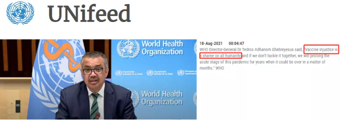 △聯(lián)合國新聞網(wǎng)站截圖。譚德塞在會上說“疫苗分配的不公平是人類的恥辱”