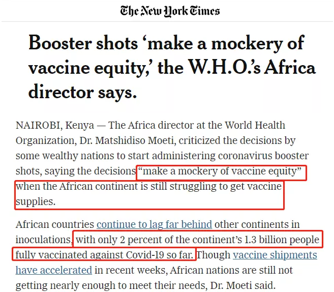 △《紐約時報(bào)》報(bào)道截圖。世衛(wèi)組織非洲區(qū)域主任莫提說,加強(qiáng)注射“是對疫苗公平的嘲弄”。