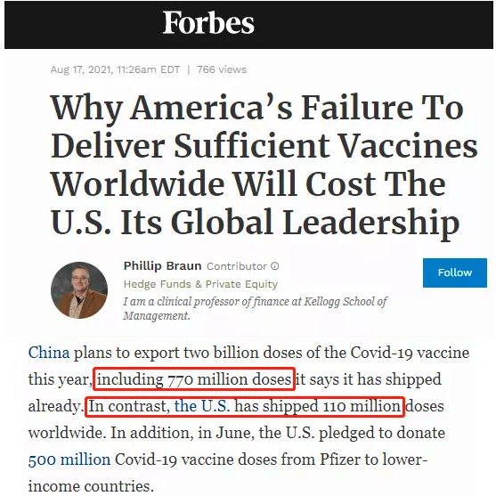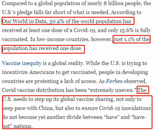 △《福布斯》文章截圖。文章說:中國已經(jīng)提供7.7億劑疫苗(我官方最新數(shù)據(jù)顯示實(shí)際已發(fā)貨約8億劑)。相比之下,美國只向全世界運(yùn)送了1.1億劑疫苗。