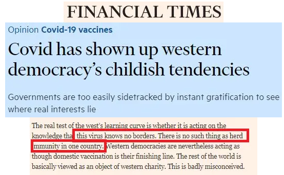 英國《金融時報(bào)》在《新冠病毒暴露了西方民主的幼稚傾向》中提到:不存在某一個國家可以獨(dú)享的群體免疫。然而,西方國家卻表現(xiàn)得好像國內(nèi)接種疫苗就是他們的終點(diǎn)線,世界其他地區(qū)基本上被視為西方慈善的對象。這是嚴(yán)重錯誤的想法。