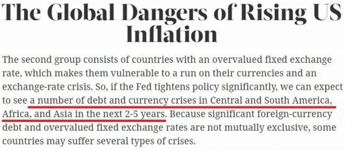 ——為了讓全世界為自己不負(fù)責(zé)任的經(jīng)濟(jì)刺激消極后果買單,美聯(lián)儲憑借美元霸權(quán)不斷超發(fā)貨幣,向世界各國輸出通脹,成為“全球第一貨幣濫發(fā)國”,世界報(bào)業(yè)辛迪加的報(bào)道就此批評指出,美國的這番操作將給全世界帶來輸入性通脹危險(xiǎn)。一旦美聯(lián)儲轉(zhuǎn)向大幅收緊貨幣政策,可以預(yù)計(jì)在未來2-5年內(nèi),拉美、非洲和亞洲將出現(xiàn)一系列債務(wù)和貨幣危機(jī)。