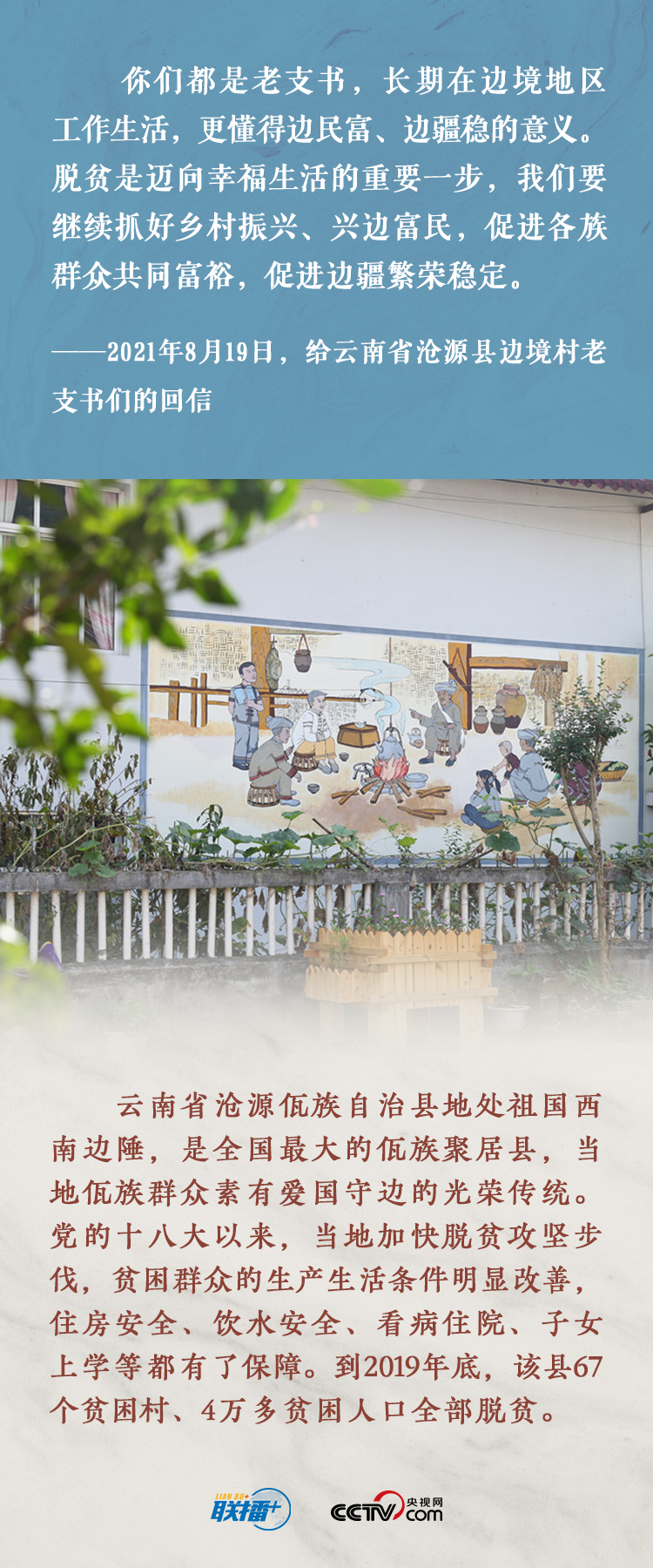 8月19日,習(xí)近平總書(shū)記給云南省滄源佤族自治縣邊境村的老支書(shū)們回信,勉勵(lì)他們發(fā)揮模范帶頭作用,引領(lǐng)鄉(xiāng)親們建設(shè)好美麗家園,維護(hù)好民族團(tuán)結(jié),守護(hù)好神圣國(guó)土。