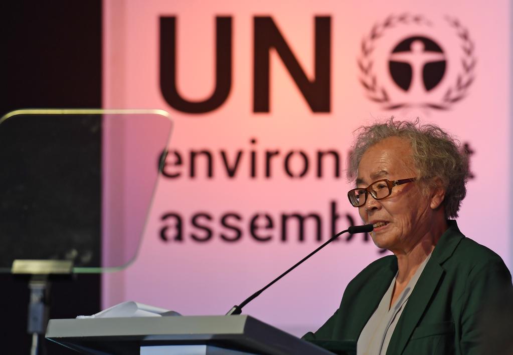 2017年12月5日,在肯尼亞內(nèi)羅畢聯(lián)合國(guó)環(huán)境規(guī)劃署總部,塞罕壩第一代務(wù)林人代表陳彥嫻在頒獎(jiǎng)晚會(huì)上發(fā)表獲獎(jiǎng)感言。新華社記者 陳誠(chéng) 攝