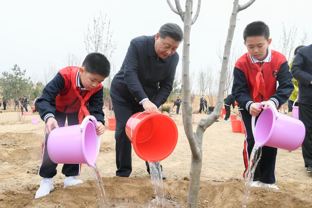 2021年4月2日,習(xí)近平總書記來到北京市朝陽區(qū)溫榆河參加首都義務(wù)植樹活動(dòng)。這是習(xí)近平總書記同少先隊(duì)員一起給剛栽下的樹苗澆水。新華社記者 李學(xué)仁 攝