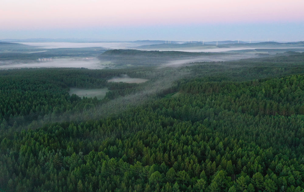 ↑塞罕壩國家森林公園晨景(2021年6月27日攝,無人機(jī)照片)。