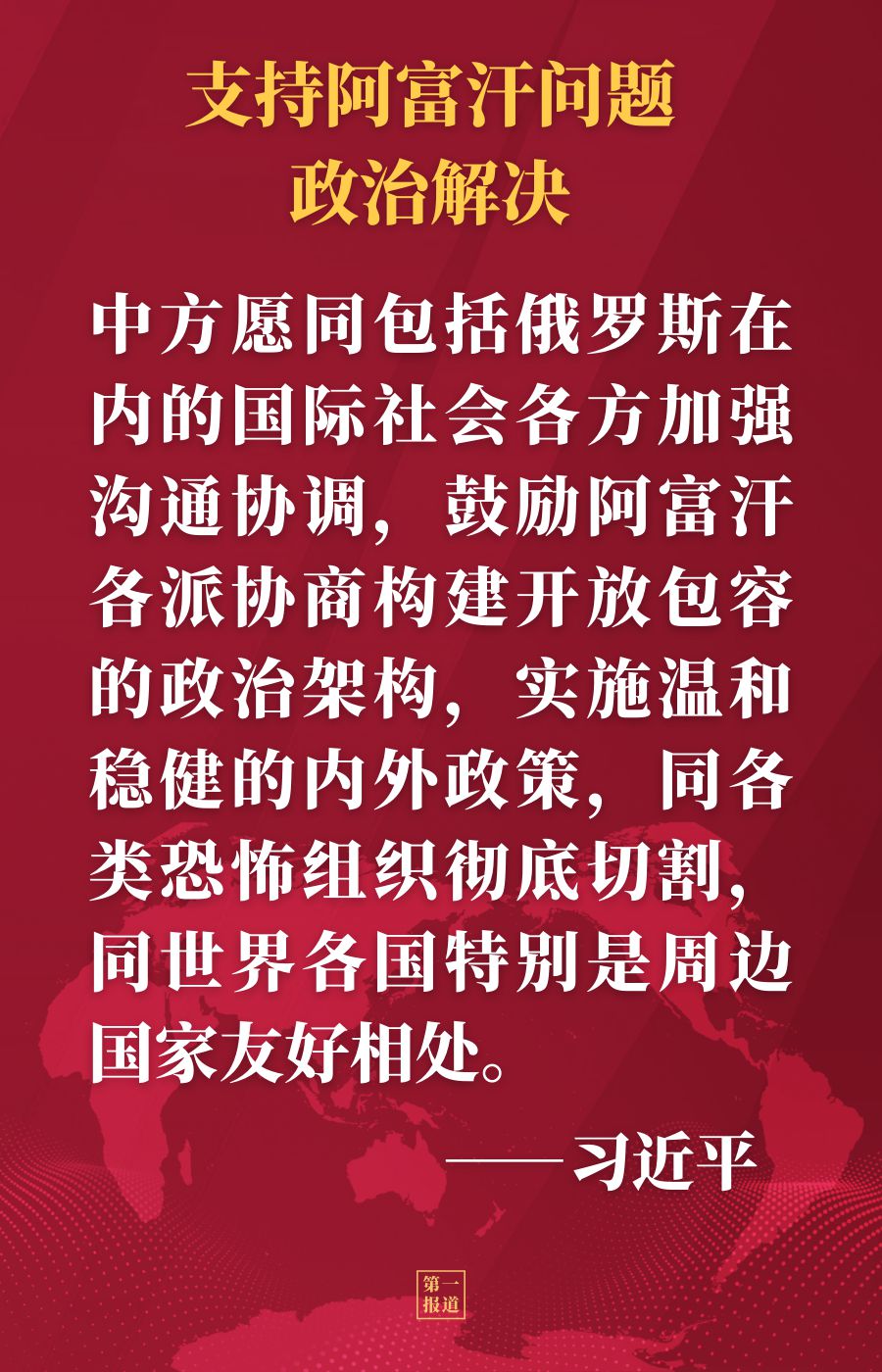 習近平強調,中方尊重阿富汗的主權、獨立、領土完整,奉行不干涉阿內政的政策,一直為政治解決阿富汗問題發(fā)揮建設性作用。中方愿同包括俄羅斯在內的國際社會各方加強溝通協(xié)調,鼓勵阿富汗各派協(xié)商構建開放包容的政治架構,實施溫和穩(wěn)健的內外政策,同各類恐怖組織徹底切割,同世界各國特別是周邊國家友好相處。