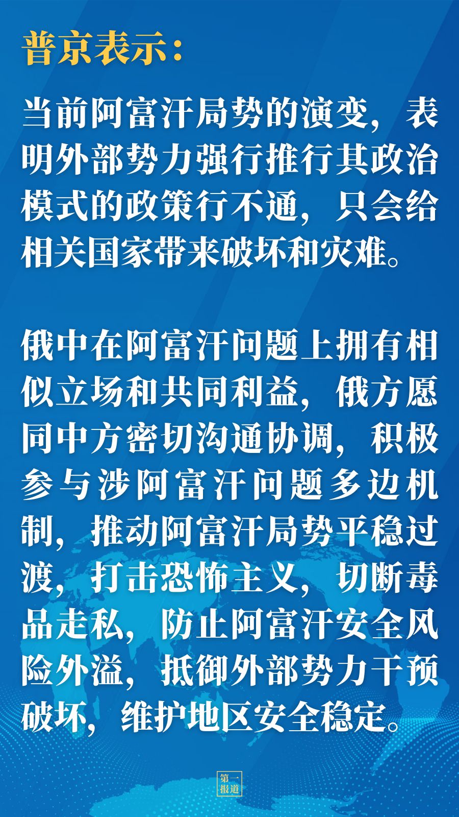 普京表示,當前阿富汗局勢的演變,表明外部勢力強行推行其政治模式的政策行不通,只會給相關國家?guī)砥茐暮蜑碾y。俄中在阿富汗問題上擁有相似立場和共同利益,俄方愿同中方密切溝通協(xié)調,積極參與涉阿富汗問題多邊機制,推動阿富汗局勢平穩(wěn)過渡,打擊恐怖主義,切斷毒品走私,防止阿富汗安全風險外溢,抵御外部勢力干預破壞,維護地區(qū)安全穩(wěn)定。