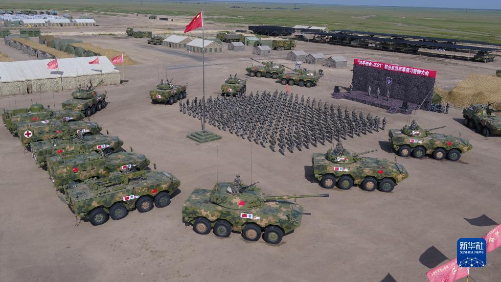 參加“和平使命-2021”聯(lián)合軍演的中方參演部隊(duì)舉行誓師大會(huì)(8月15日攝,無人機(jī)照片)。新華社發(fā)(仲崇嶺 攝)