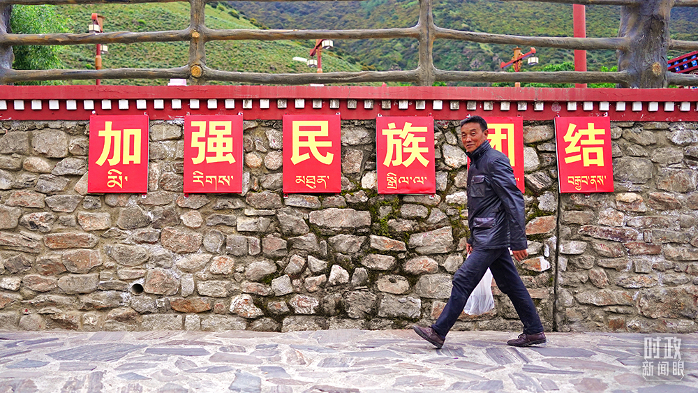 △西藏林芝嘎拉村村民走過“加強(qiáng)民族團(tuán)結(jié)”標(biāo)語墻。(總臺國廣記者李晉拍攝)