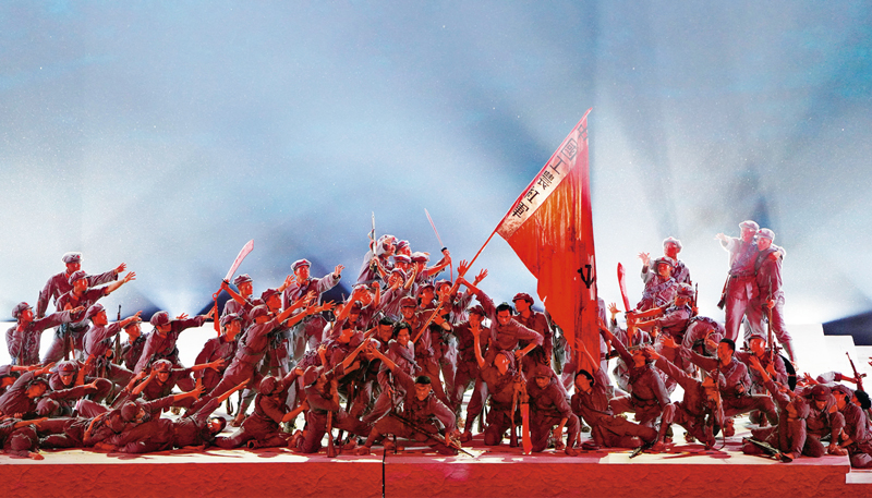 長征這一人類歷史上的偉大壯舉,留給我們最可寶貴的精神財(cái)富,就是偉大長征精神。2021年6月28日晚,慶祝中國共產(chǎn)黨成立100周年文藝演出《偉大征程》在國家體育場盛大舉行。這是戲劇與舞蹈《長征》。 新華社記者 陳曄華/攝