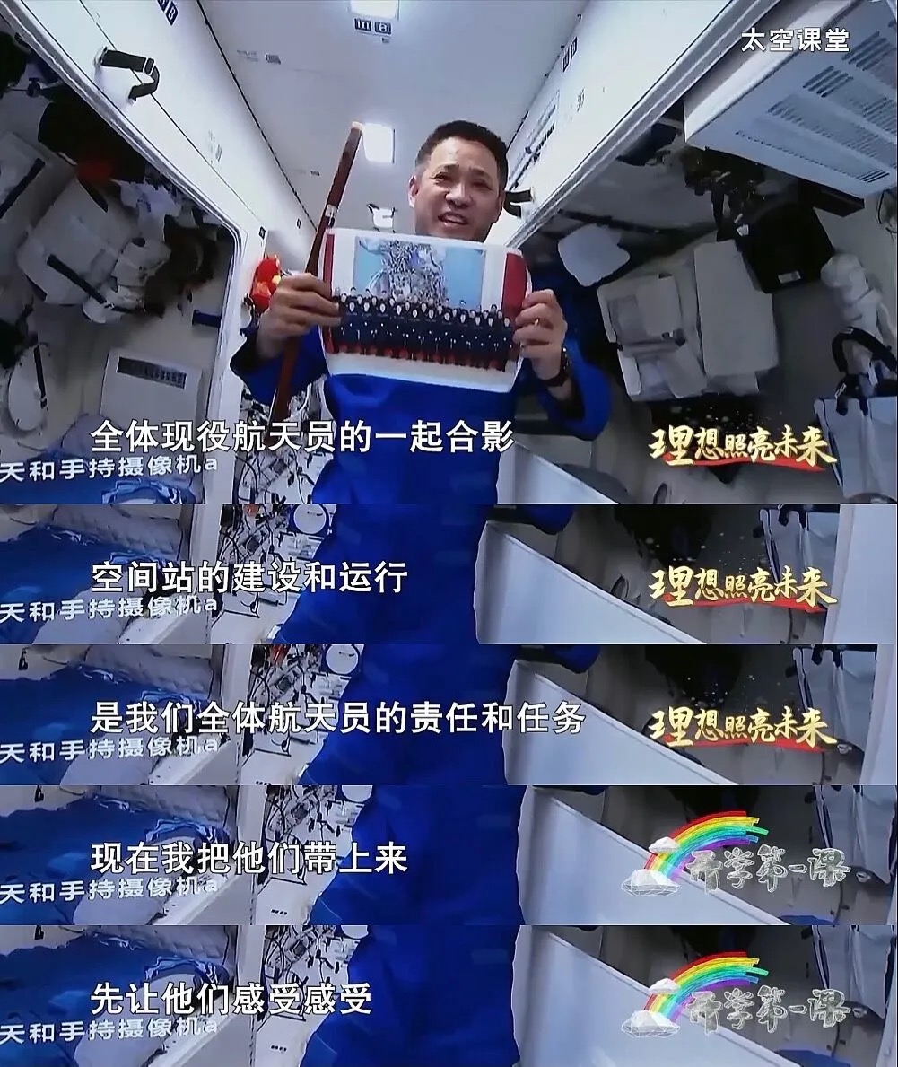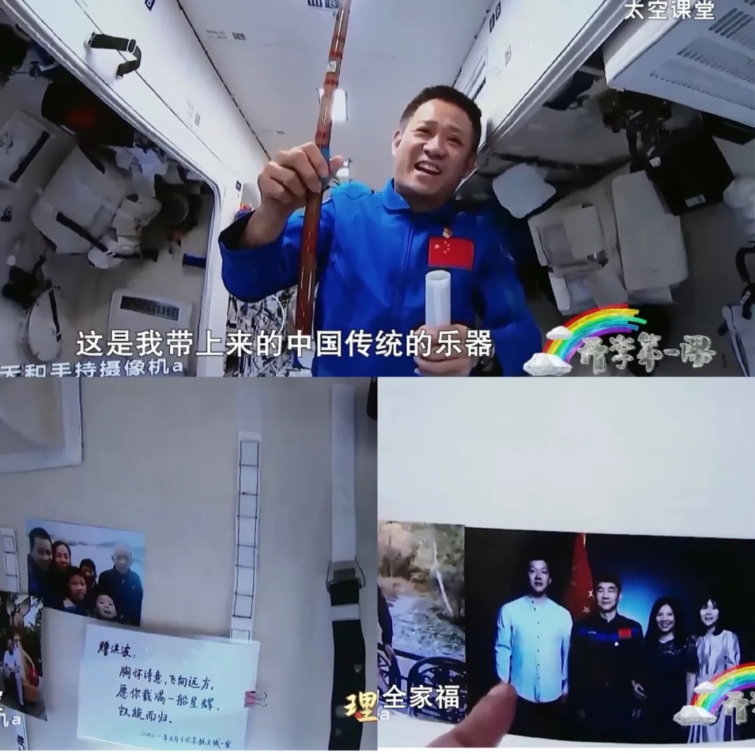 除此之外,三位航天員還向孩子們展示了跟隨他們一起進(jìn)入太空的其他物件。例如,聶海勝的笛子、劉伯明的全家福、湯洪波的全家福以及妻子的手寫(xiě)卡片。
