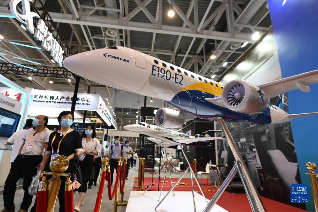 這是2021金磚國家新工業(yè)革命展巴西航空工業(yè)公司展位展出的飛機(jī)模型(9月8日攝)。新華社記者 林善傳 攝
